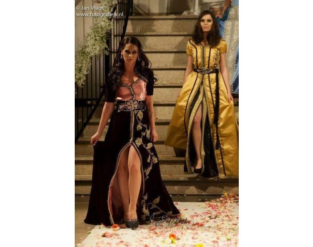 caftan marocain en couleur noire et rose crevette