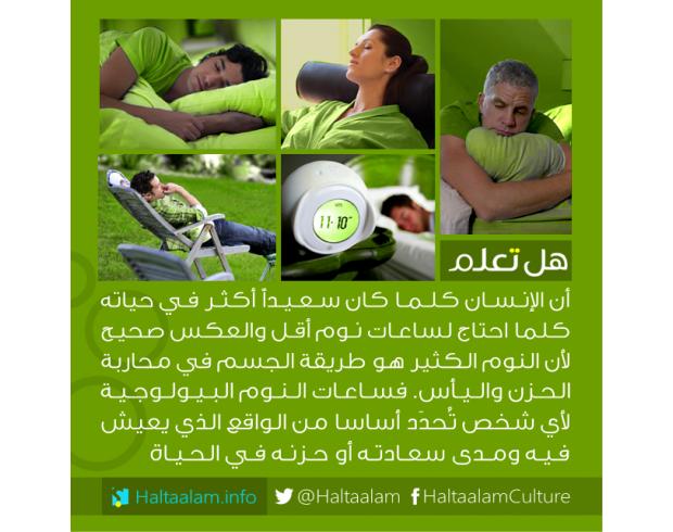 كلما كان الشخص سعيداً كلما احتاج لساعات نوم أقل لأن النوم الكثير هو طريقة لمحاربة الحزن...