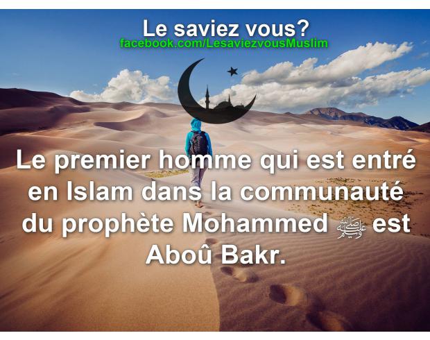 Ibnou l-Jawziyy a rapporté dans son livre « Sifatou s-Safwah » que le premier homme qui est entré en Islam dans la communauté du Prophète Mohammed est Aboû Bakr. Par ailleurs, Ibnou `Abbâs a dit : « Le premier (après le prophète) à avoir fait la prière était Aboû Bakr ».