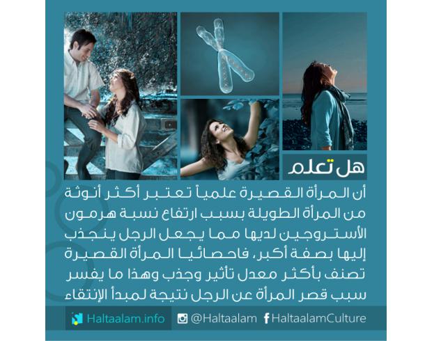 المرأة القصيرة علميا أكثر أنوثة من المرأة الطويلة بسبب ارتفاع نسبة الأستروجين لديها مما يجعل الرجل ينجذب إليها أكثر من غيرها...